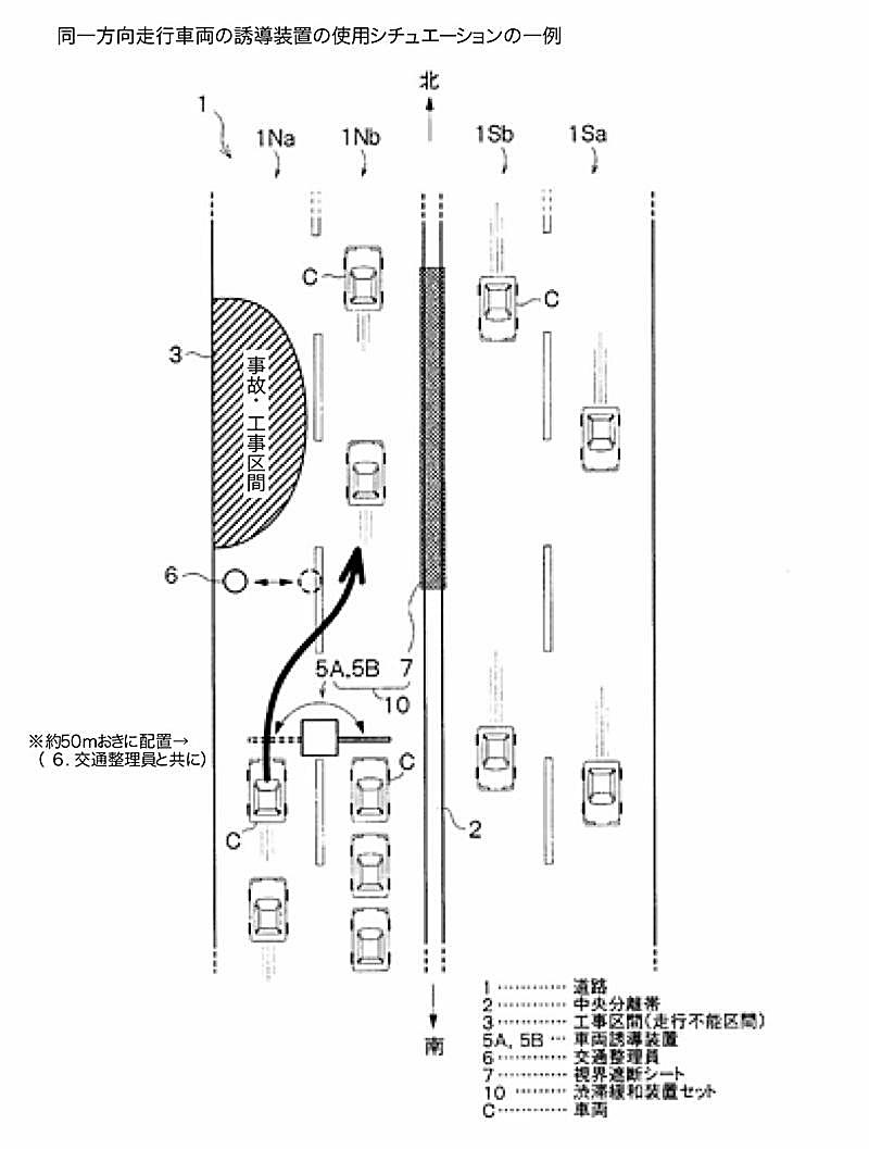 同一方向走行車両の誘導装置(図=10)を適切に使用することにより、走行不能区間を車両が通過する際に、従来ように車両平均速度が10km/h前後まで低下することがなく、約40〜50km/h前後まで車両平均速度を 上げることを期待できる。そのため、交通渋滞を緩和することができ、渋滞が発生した場合であっても渋滞距離を短くすることができる。